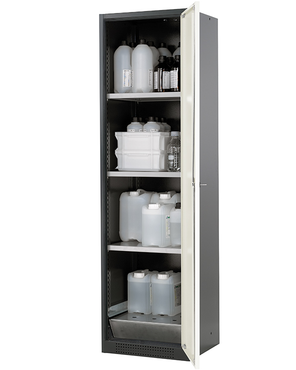 corps gris anthracite (RAL 7016), avec porte battante en blanc pur (RAL 9010), équipée avec 3 x étagère, 1 x caillebotis, 1 x bac de rétention au sol (tôle d'acier galvanisé)