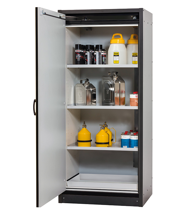 corps gris anthracite, avec porte battante en jaune sécurité (RAL 1004), équipée avec 3 x étagère, 1 x bac de rétention au sol (tôle d'acier revêtement époxy)