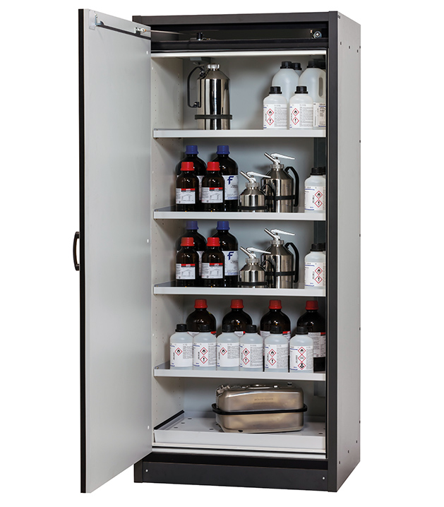 corps gris anthracite, avec porte battante en gris clair (RAL 7035), équipée avec 4 x étagère, 1 x caillebotis, 1 x bac de rétention au sol (tôle d'acier revêtement époxy)
