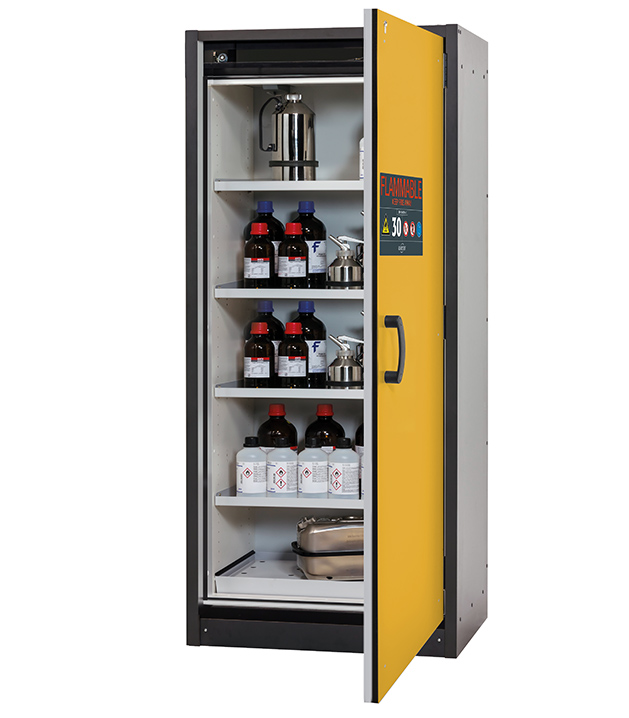 corps gris anthracite, avec porte battante en jaune sécurité (RAL 1004), équipée avec 4 x étagère, 1 x caillebotis, 1 x bac de rétention au sol (tôle d'acier revêtement époxy)