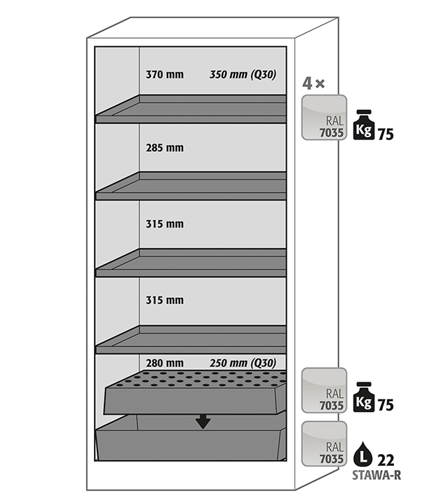 corps gris anthracite, avec porte battante en gris clair (RAL 7035), équipée avec 4 x étagère, 1 x caillebotis, 1 x bac de rétention au sol (tôle d'acier revêtement époxy)