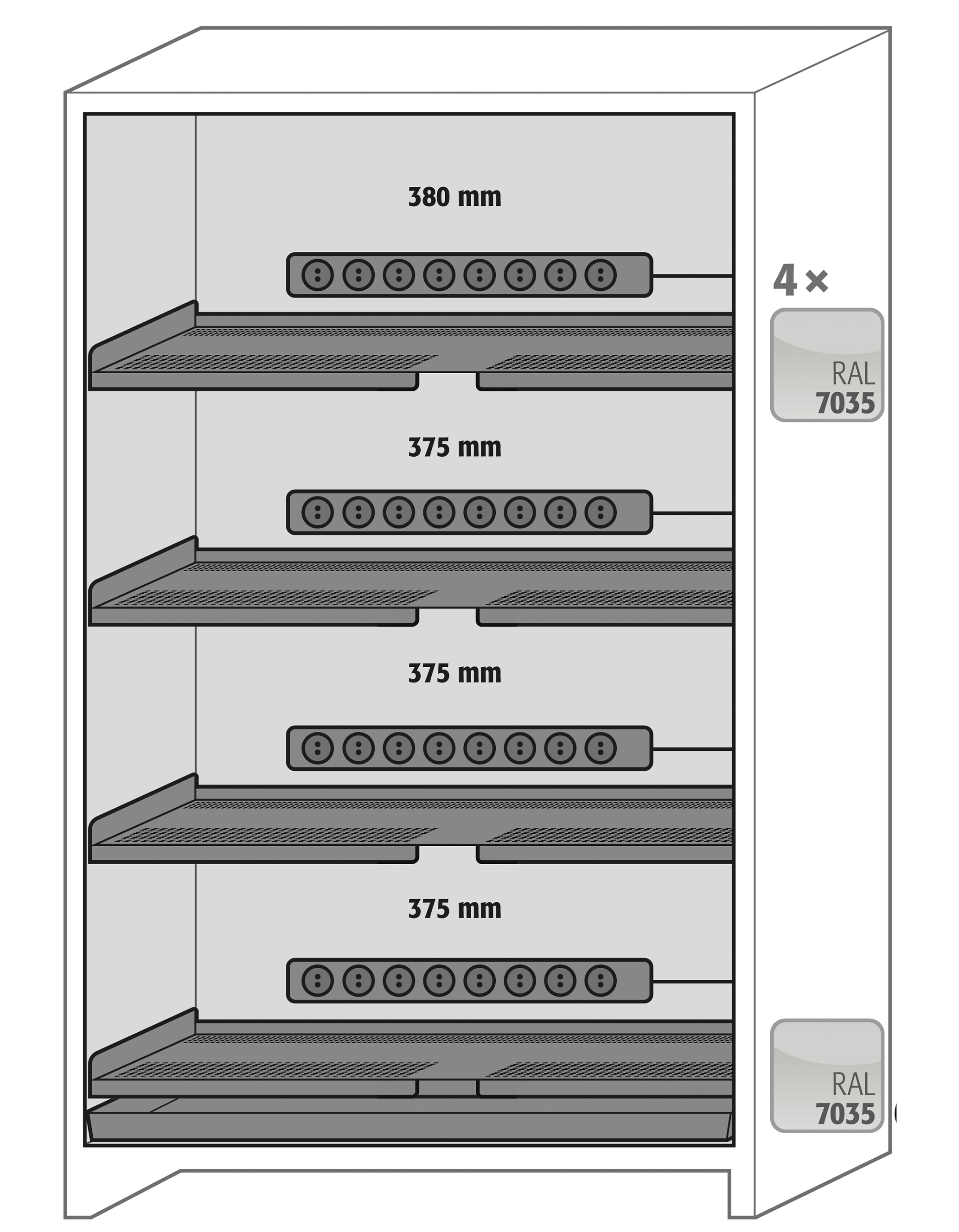 corps gris anthracite (RAL 7016), avec portes battantes en bleu gentiane (RAL 5010), équipée avec 4 x blocs multiprises version suisse, 4 x étagère isolée, 1 x bac de rétention au sol (tôle d'acier revêtement époxy)