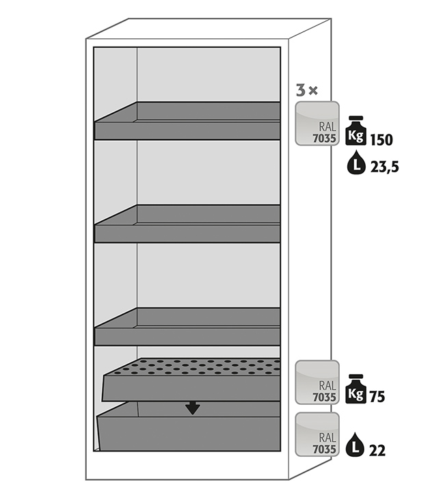 corps gris anthracite, avec porte battante en gris clair (RAL 7035), équipée avec 3 x étagère de rétention, 1 x caillebotis, 1 x bac de rétention au sol (tôle d'acier revêtement époxy)
