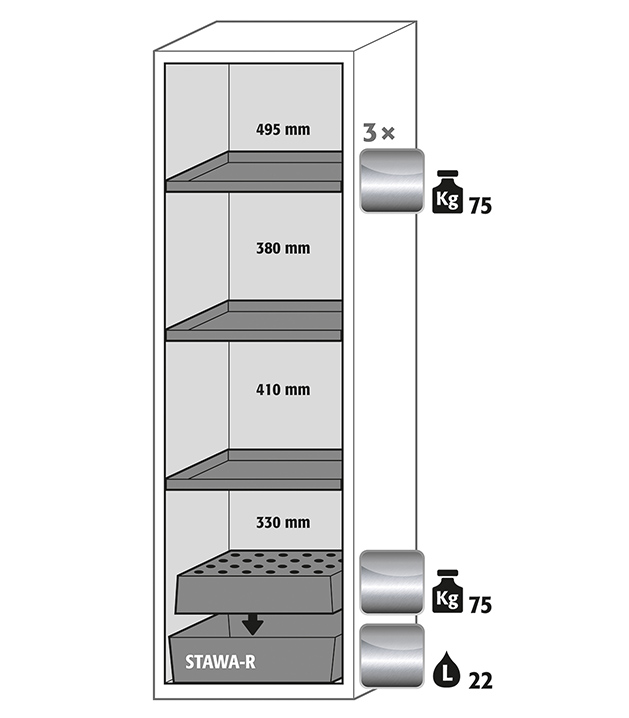 Veuillez respecter les lois, règles nationales applicables lors de la configuration d'une armoire de sécurité concernant le stockage des matières dangereuses. En cas de doute, les experts asecos restent à votre disposition.