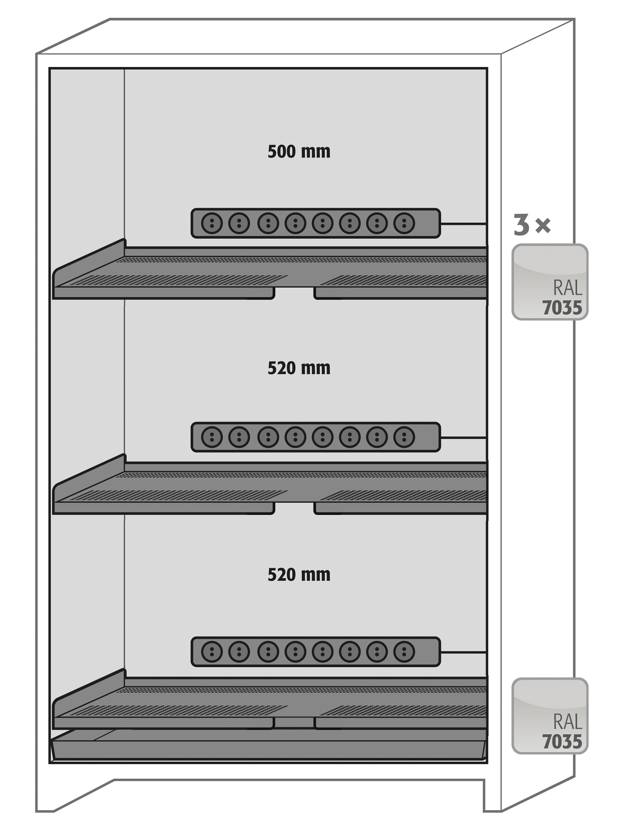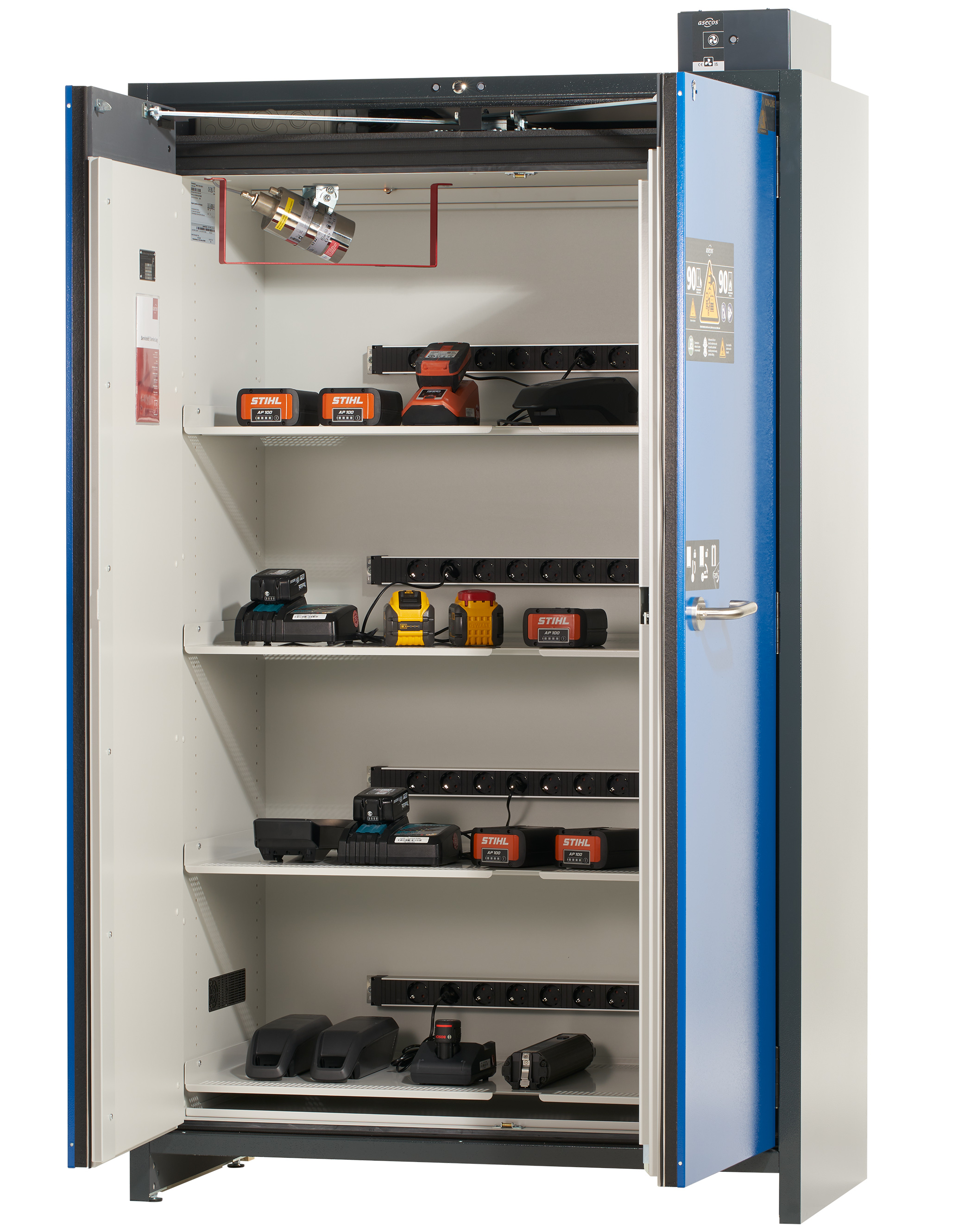 corps gris anthracite (RAL 7016), avec portes battantes en bleu gentiane (RAL 5010), équipée avec 3 x blocs multiprises version française et belge, 3 x étagère isolée, 1 x bac de rétention au sol (tôle d'acier revêtement époxy)