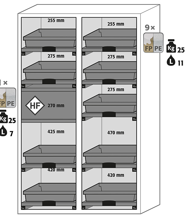 Blanc Laboratoire (sim. RAL 9016), équipée avec 9 x étagère coulissante (panneau/PP mélamine), 1 x compartiment pour l’acide fluorhydrique (panneau / PE mélamine)