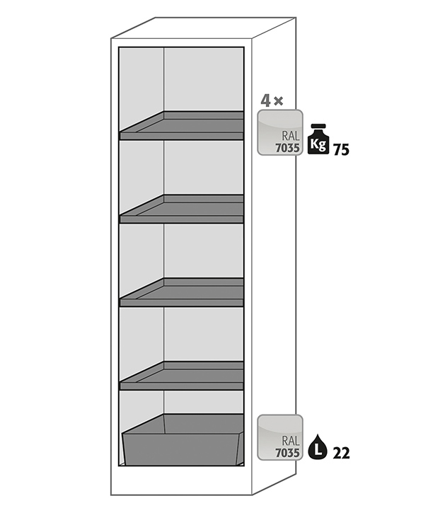 corps gris anthracite (RAL 7016), avec porte battante en jaune sécurité (RAL 1004), équipée avec 4 x étagère, 1 x bac de rétention au sol (tôle d'acier revêtement époxy)