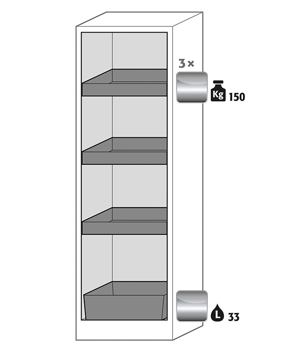 corps gris anthracite (RAL 7016), avec porte battante en gris clair (RAL 7035), équipée avec 3 x étagère de rétention (acier inoxydable 1.4301), 1 x bac de rétention au sol (acier inoxydable 1.4016)
