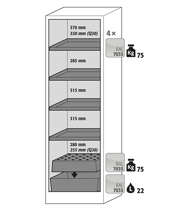 corps gris anthracite (RAL 7016), avec porte battante en gris clair (RAL 7035), équipée avec 4 x étagère, 1 x caillebotis, 1 x bac de rétention au sol (tôle d'acier revêtement époxy)