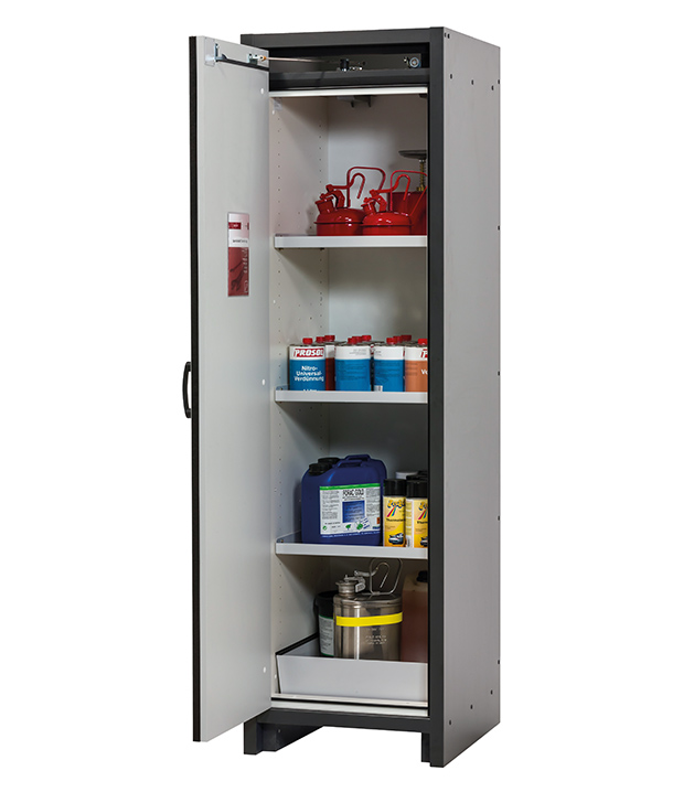corps gris anthracite, avec porte battante en jaune sécurité (RAL 1004), équipée avec 3 x étagère, 1 x caillebotis, 1 x bac de rétention au sol (tôle d'acier revêtement époxy)