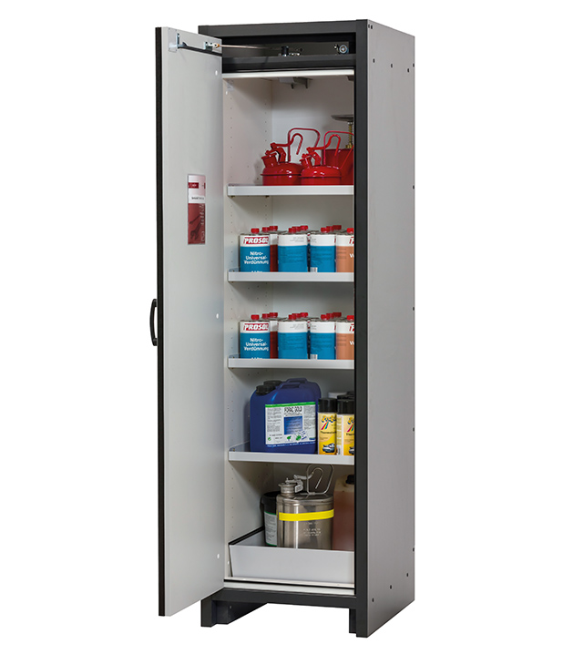 corps gris anthracite, avec porte battante en gris clair (RAL 7035), équipée avec 4 x étagère, 1 x caillebotis, 1 x bac de rétention au sol (tôle d'acier revêtement époxy)