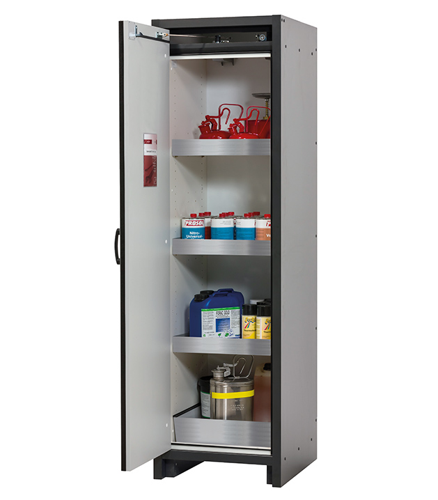 corps gris anthracite, avec porte battante en gris clair (RAL 7035), équipée avec 3 x étagère de rétention, 1 x caillebotis, 1 x bac de rétention au sol (tôle d'acier revêtement époxy)