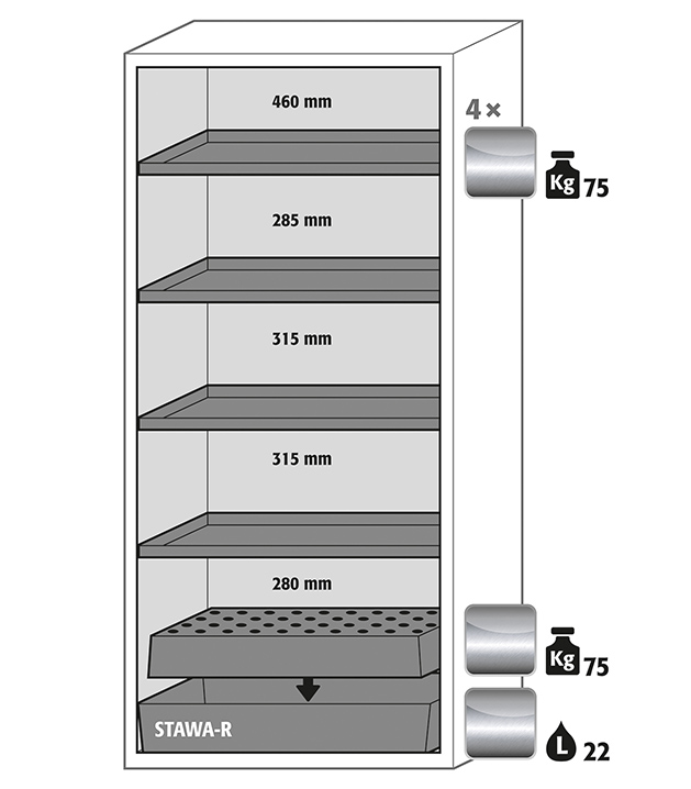 jaune sécurité (RAL 1004), équipée avec 4 x étagère (acier inoxydable 1.4301), 1 x caillebotis (acier inoxydable 1.4016), 1 x bac de rétention au sol (acier inoxydable 1.4301)