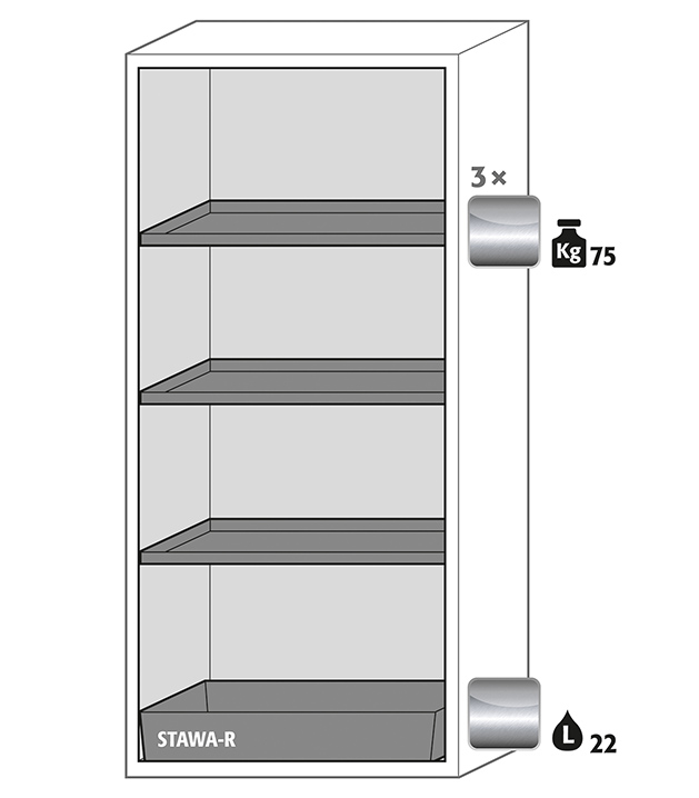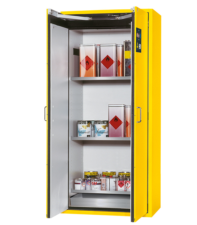 jaune sécurité (RAL 1004), équipée avec 3 x étagère, 1 x bac de rétention au sol (acier inoxydable 1.4301)