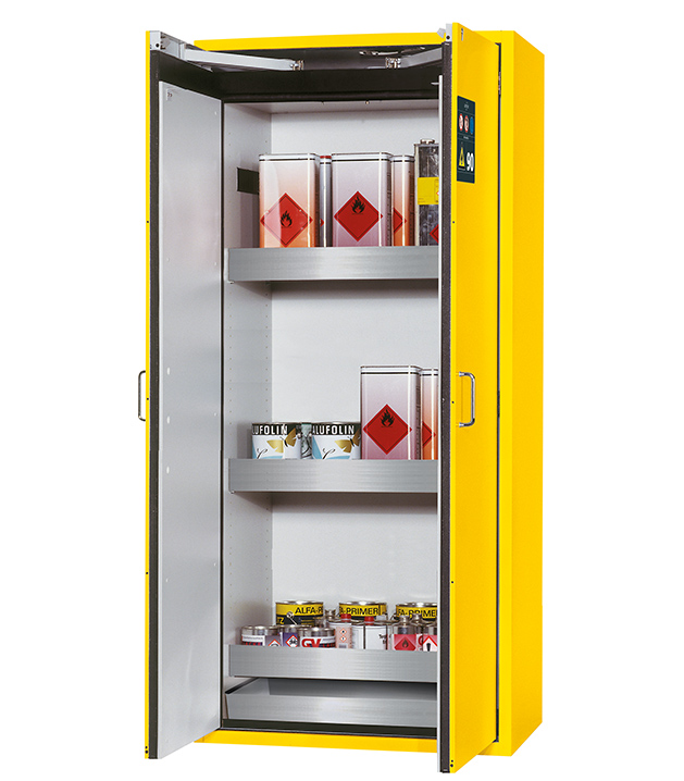 jaune sécurité (RAL 1004), équipée avec 3 x étagère de rétention, 1 x bac de rétention au sol (acier inoxydable 1.4301)