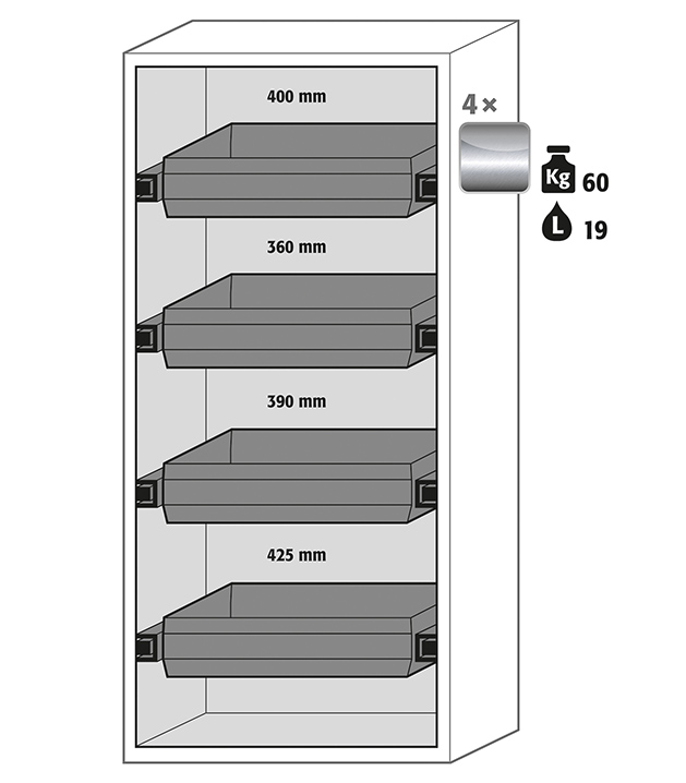 jaune sécurité (RAL 1004), équipée avec 4 x tiroir (acier inoxydable 1.4301)