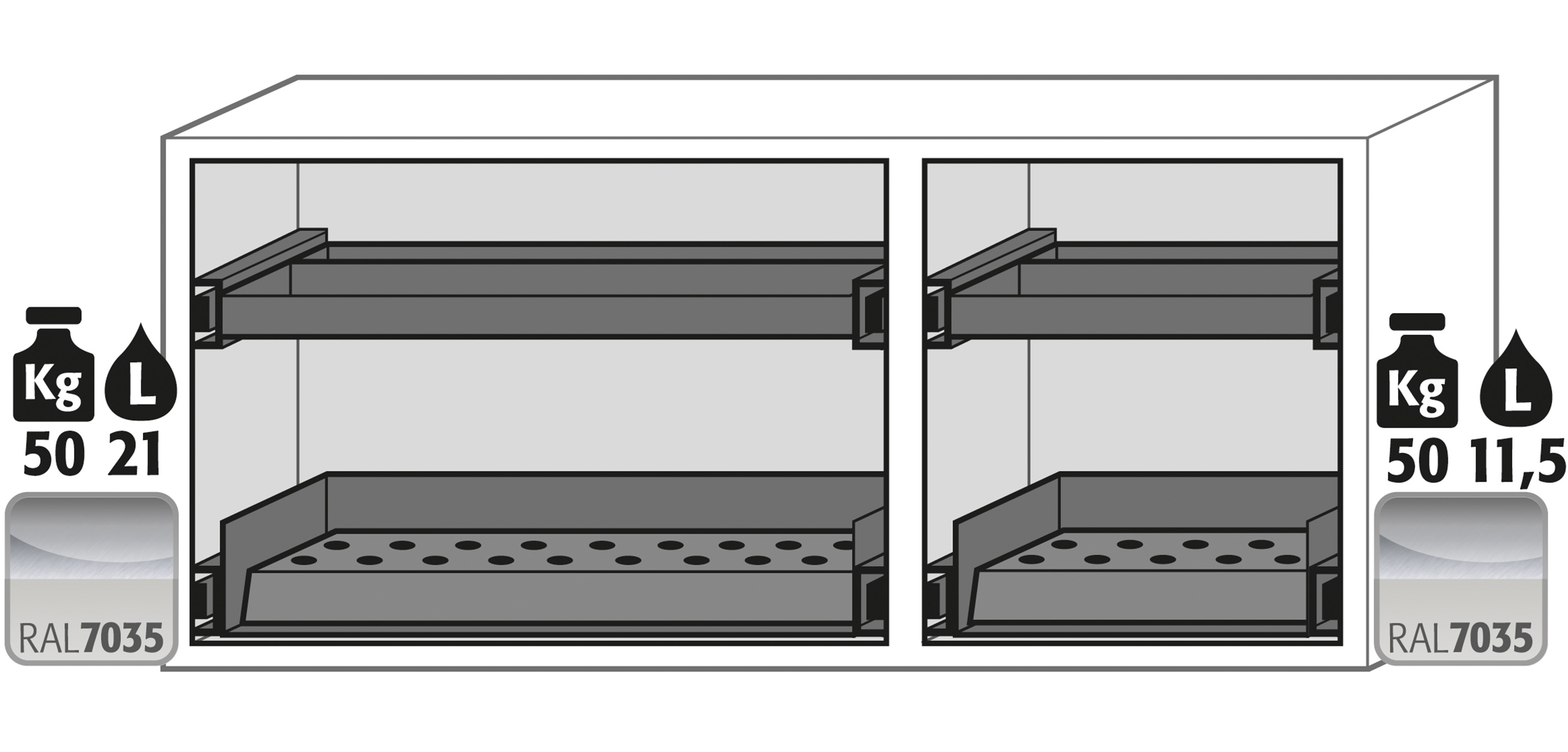 gris clair (RAL 7035), équipée avec 1 x tiroir (tôle d'acier revêtement époxy), 1 x caillebotis (acier inoxydable 1.4016), 1 x deuxième niveau de tiroir, 1 x tiroir (tôle d'acier revêtement époxy), 1 x caillebotis (acier inoxydable 1.4016), 1 x deuxième niveau de tiroir (tôle d'acier revêtement époxy)