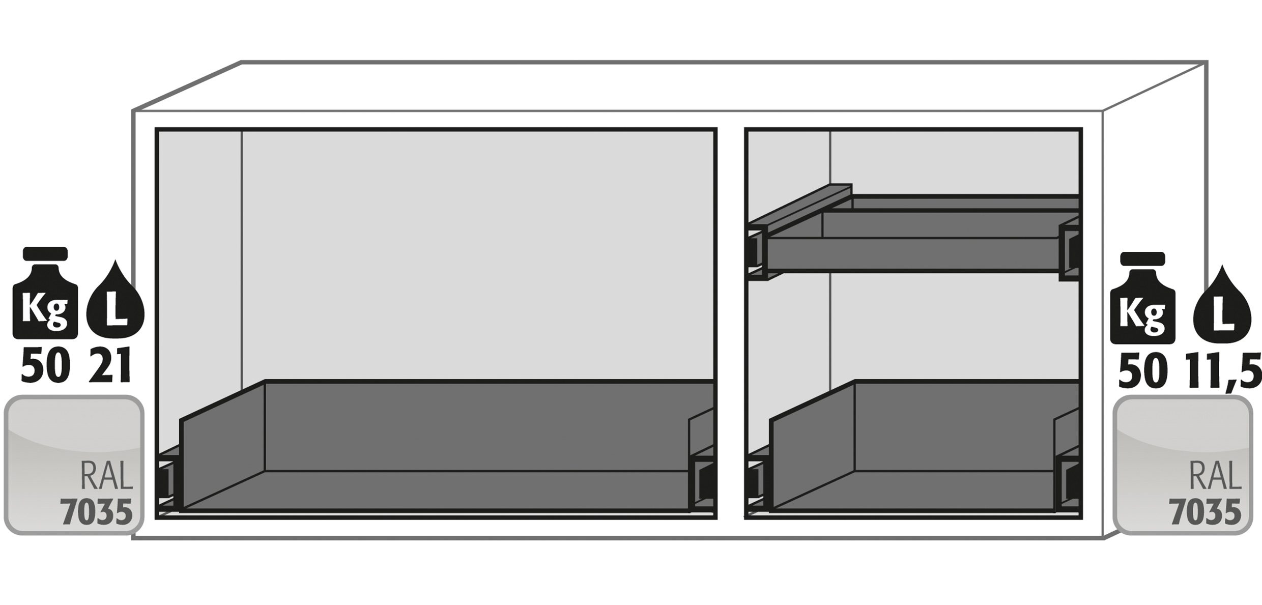 gris clair (RAL 7035), équipée avec 1 x tiroir, 1 x tiroir, 1 x deuxième niveau de tiroir (tôle d'acier revêtement époxy)
