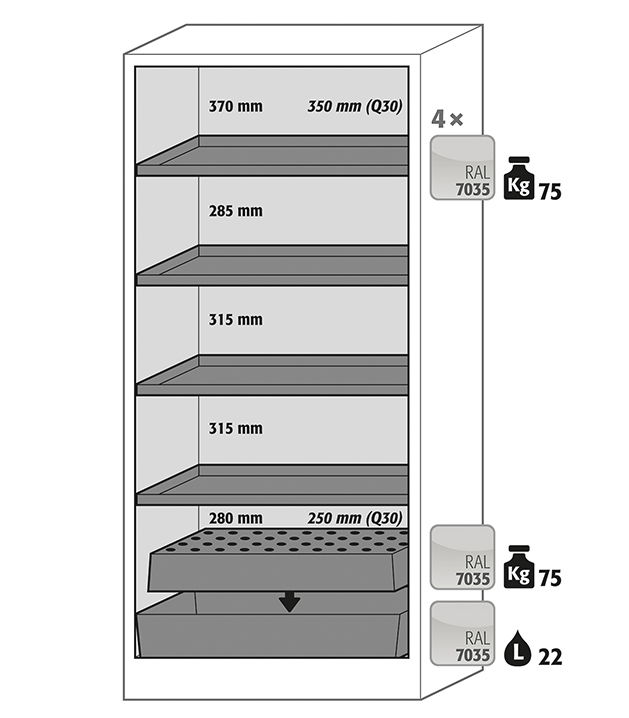 corps gris anthracite, avec porte battante en gris clair (RAL 7035), équipée avec 4 x étagère, 1 x caillebotis, 1 x bac de rétention au sol (tôle d'acier revêtement époxy)