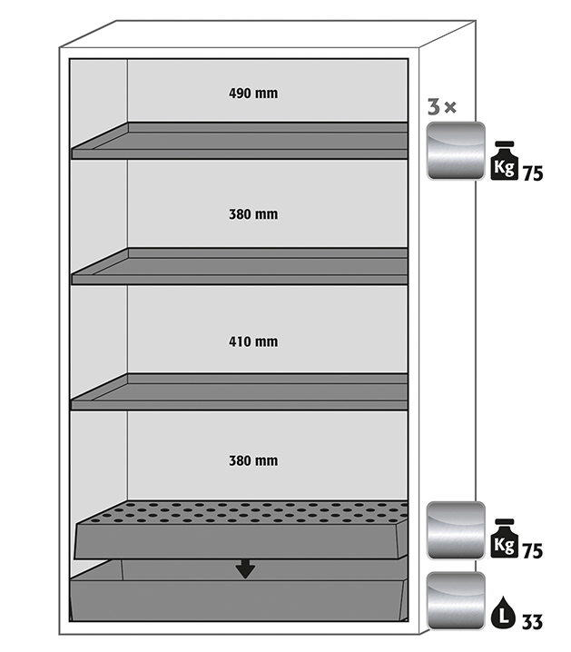 Veuillez respecter les lois, règles nationales applicables lors de la configuration d'une armoire de sécurité concernant le stockage des matières dangereuses. En cas de doute, les experts asecos restent à votre disposition.
