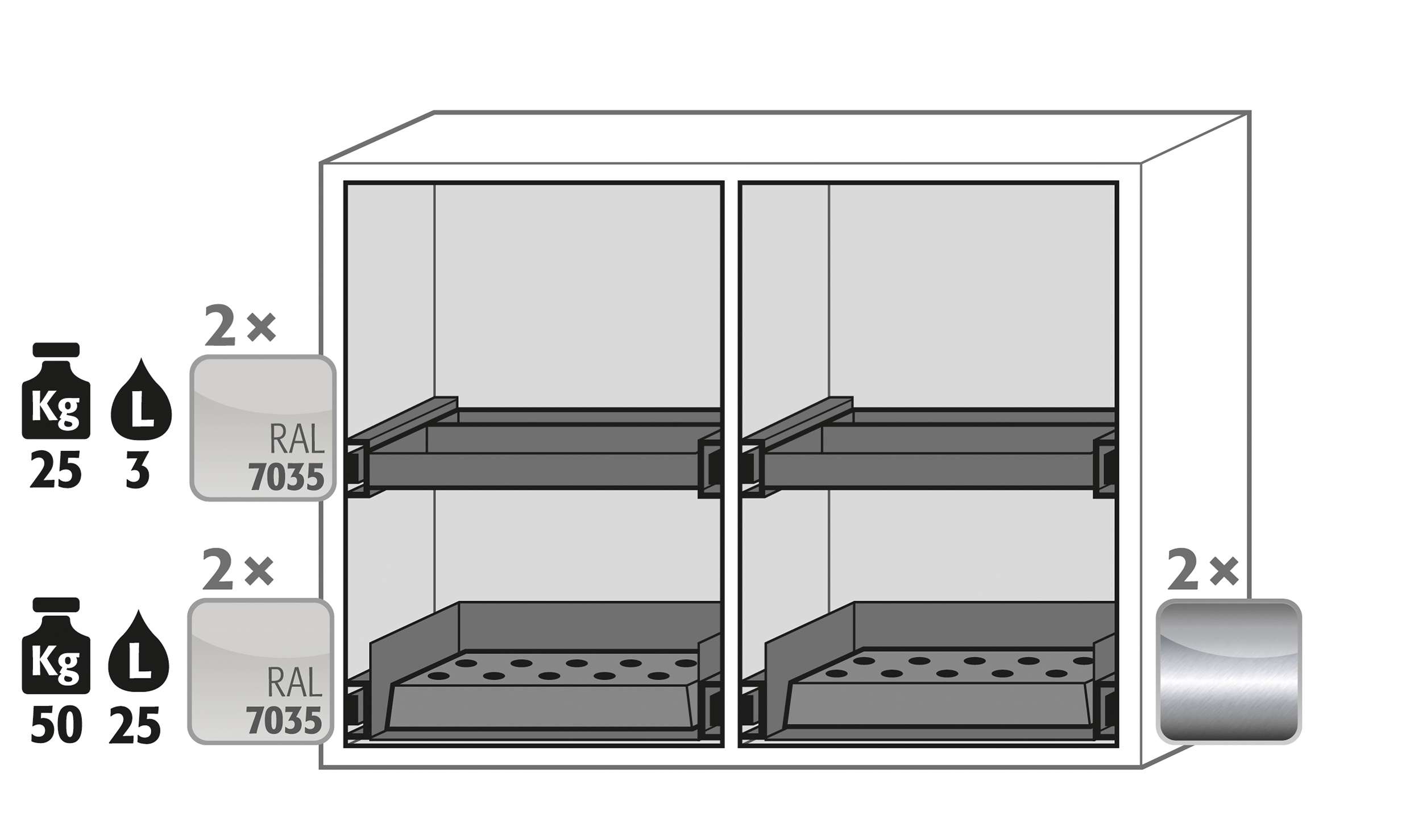 gris clair (RAL 7035), équipée avec 2 x tiroir (tôle d'acier revêtement époxy), 2 x caillebotis (acier inoxydable 1.4016), 2 x deuxième niveau de tiroir (tôle d'acier revêtement époxy)