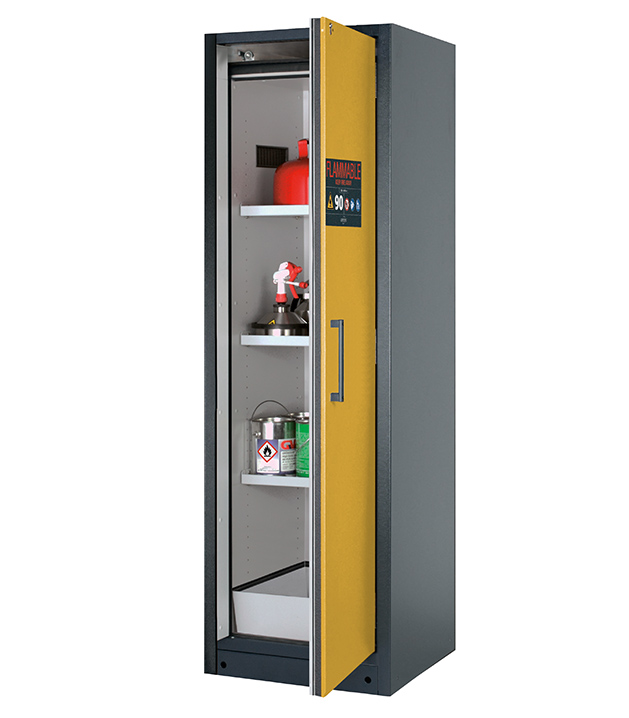 corps gris anthracite (RAL 7016), avec porte battante en jaune sécurité (RAL 1004), équipée avec 3 x étagère, 1 x bac de rétention au sol (tôle d'acier revêtement époxy)