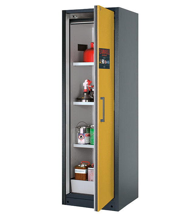 corps gris anthracite (RAL 7016), avec porte battante en jaune sécurité (RAL 1004), équipée avec 3 x étagère, 1 x caillebotis, 1 x bac de rétention au sol (tôle d'acier revêtement époxy)
