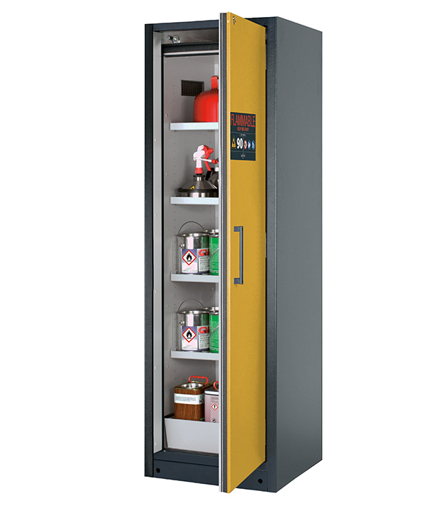corps gris anthracite (RAL 7016), avec porte battante en jaune sécurité (RAL 1004), équipée avec 4 x étagère, 1 x caillebotis, 1 x bac de rétention au sol (tôle d'acier revêtement époxy)