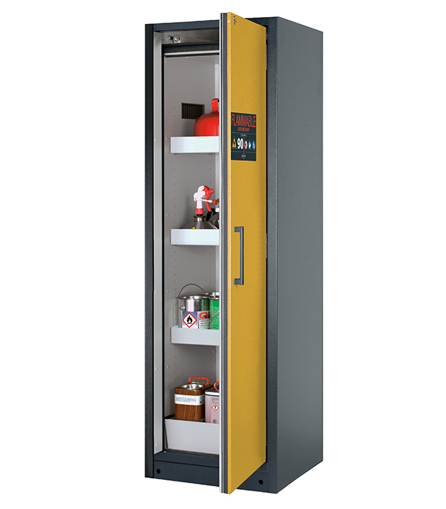 corps gris anthracitegris anthracite (RAL 7016RAL 7016), avec porte battante en jaune sécuritéjaune sécurité (RAL 1004RAL 1004), équipée avec 3 x étagère de rétention, 1 x caillebotis, 1 x bac de rétention au sol (tôle d'acier revêtement époxy)