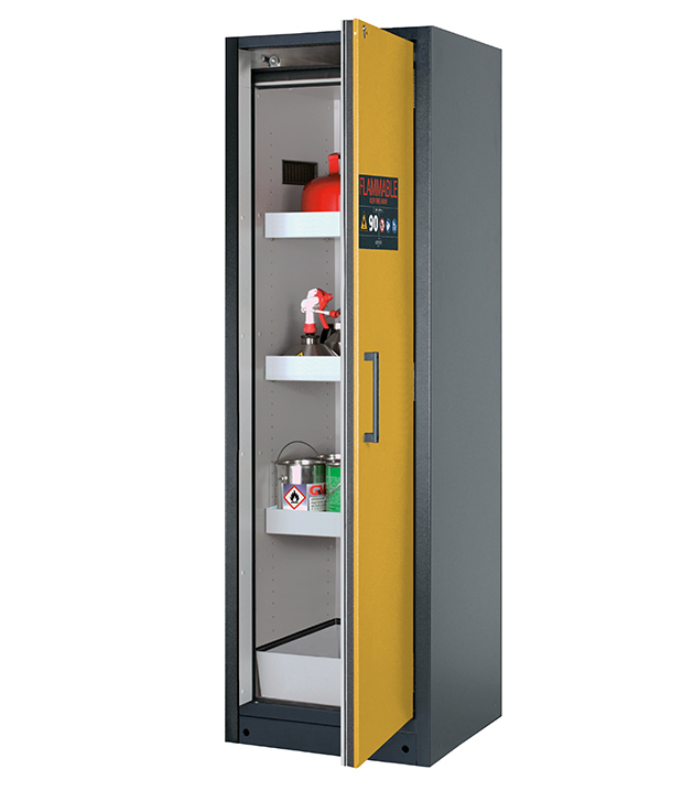 corps gris anthracitegris anthracite (RAL 7016RAL 7016), avec porte battante en jaune sécuritéjaune sécurité (RAL 1004RAL 1004), équipée avec 3 x étagère de rétention, 1 x bac de rétention au sol (tôle d'acier revêtement époxy)