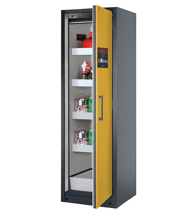 corps gris anthracite (RAL 7016), avec porte battante en jaune sécurité (RAL 1004), équipée avec 4 x étagère de rétention, 1 x bac de rétention au sol (tôle d'acier revêtement époxy)