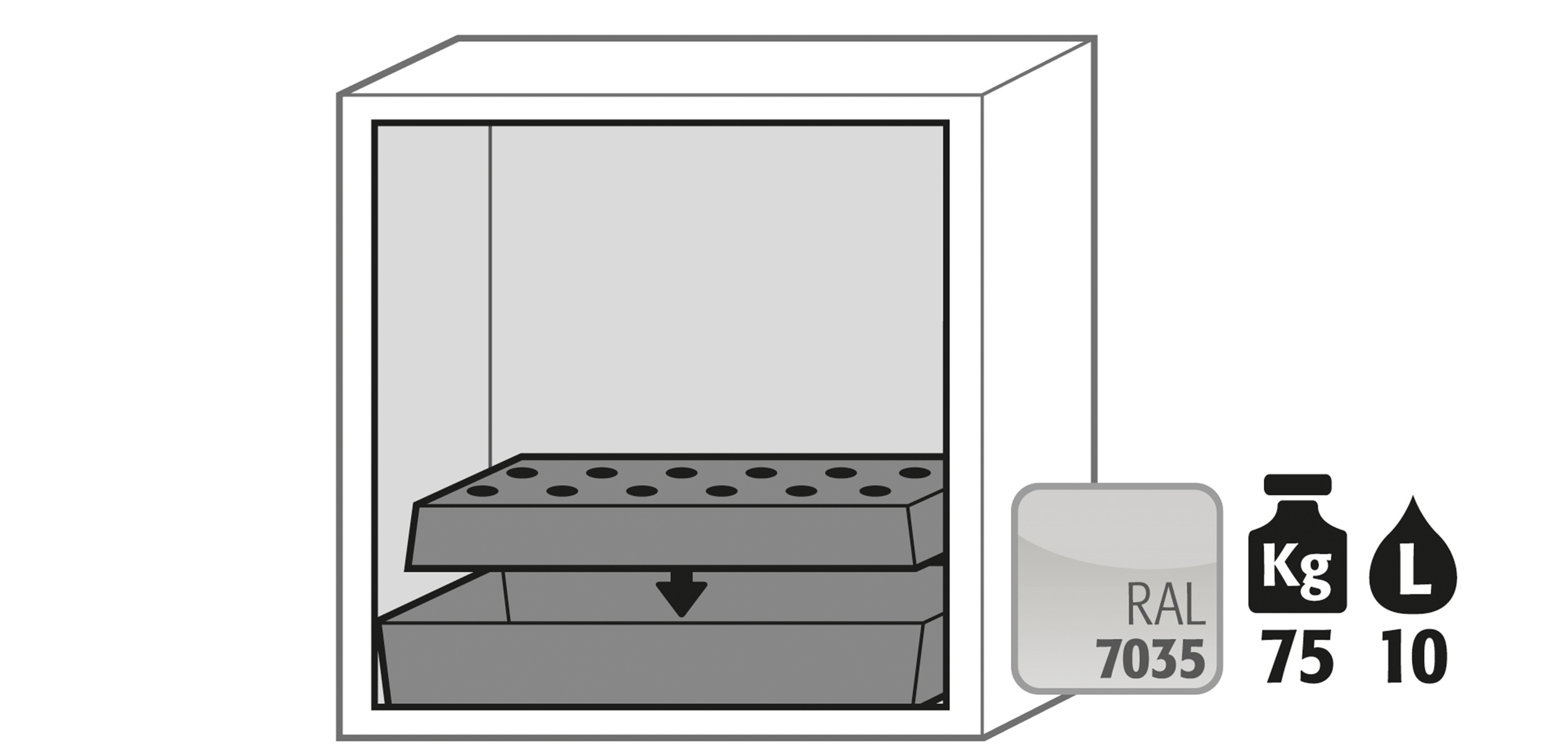 gris clair (RAL 7035), équipée avec 1 x caillebotis, 1 x bac de rétention au sol (tôle d'acier revêtement époxy)