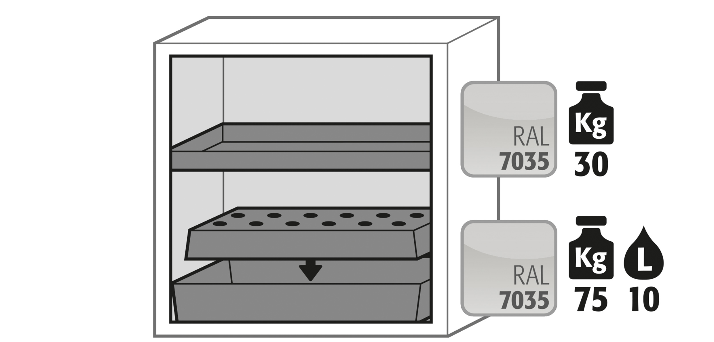 gris clair (RAL 7035), équipée avec 1 x étagère, 1 x caillebotis, 1 x bac de rétention au sol (tôle d'acier revêtement époxy)