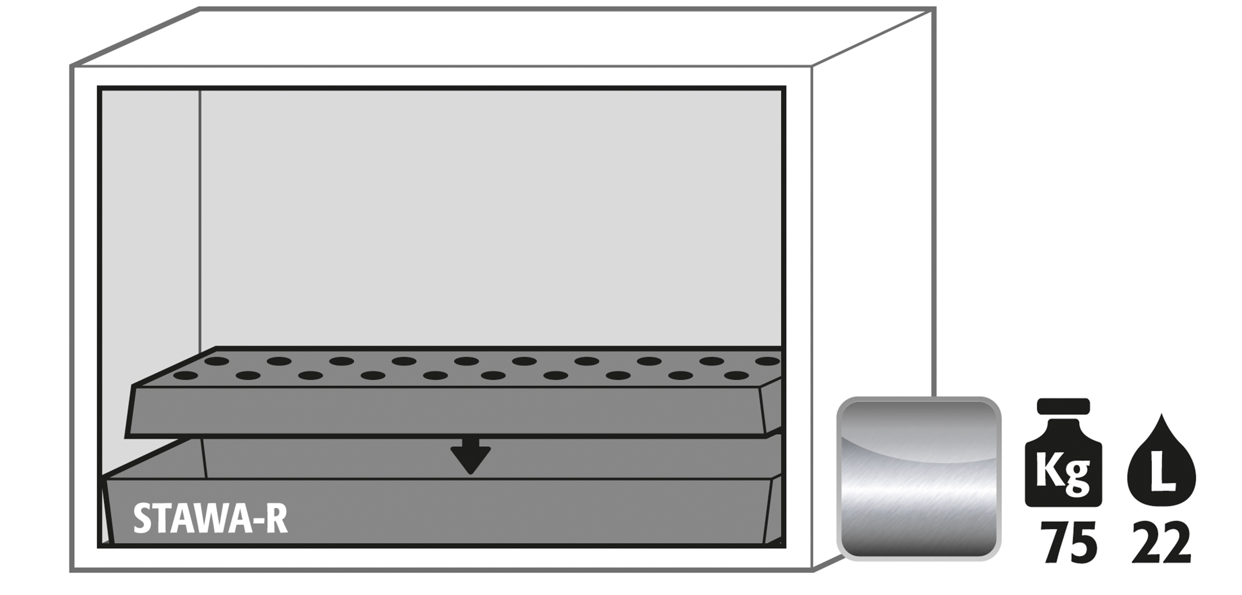 Blanc Laboratoire (sim. RAL 9016), équipée avec 1 x caillebotis (acier inoxydable 1.4016), 1 x bac de rétention au sol (acier inoxydable 1.4301)