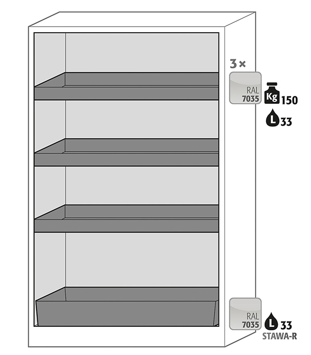 rompkleur antracietgrijs, met draaideuren in Lichtgrijs (RAL 7035), Interieur met 3 x opvanglegbord, 1 x bodemopvangbak (plaatstaal met epoxy coating)