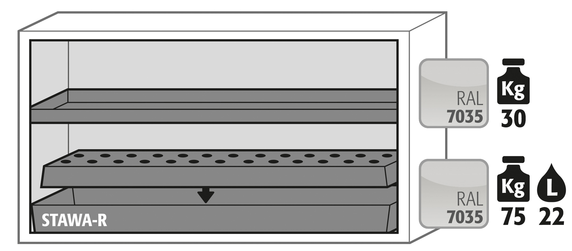 Lichtgrijs (RAL 7035), Interieur met 1 x legbord, 1 x inzetrooster, 1 x bodemopvangbak (plaatstaal met epoxy coating)
