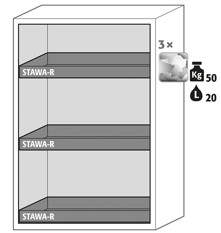 rompkleur gentiaanblauw (RAL 5010), met draaideuren in Lichtgrijs (RAL 7035), Interieur met 2 x opvanglegbord STAWA-R (plaatstaal verzinkt), 1 x bodemopvangbak (plaatstaal verzinkt)