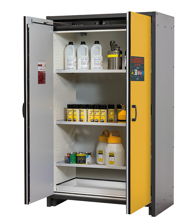 rompkleur antracietgrijs, met draaideuren in signaalgeel (RAL 1004), Interieur met 3 x legbord, 1 x bodemopvangbak (plaatstaal met epoxy coating)