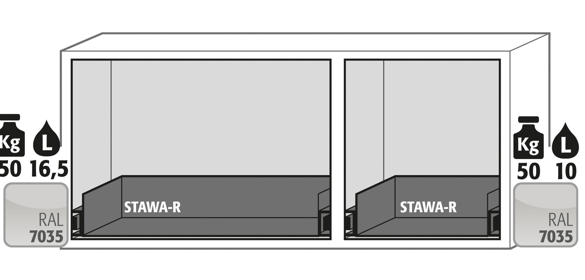 Lichtgrijs (RAL 7035), Interieur met 1 x schuiflade met opvangbak, 1 x schuiflade met opvangbak (plaatstaal met epoxy coating)