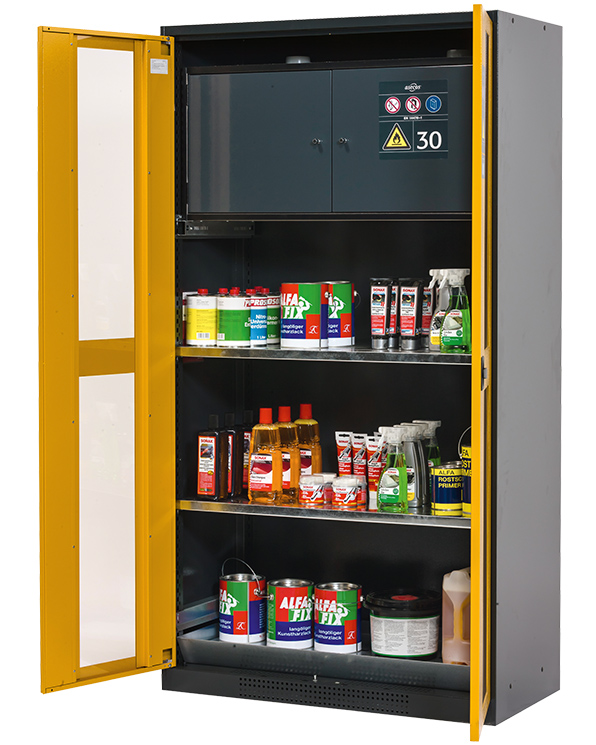 - Säkerhetslåda typ 30: för korrekt förvaring av brandfarliga farliga material i arbetsrum, enligt EN 14470-1 (typ 30) och TRGS 510, 2 självstängande gångjärnsdörrar, nedre uppsamlingsbrunn, pulverlackerat stål med 8,5 liters volym och anslutning till frånluft (DN) 75) för teknisk ventilation av säkerhetslådan