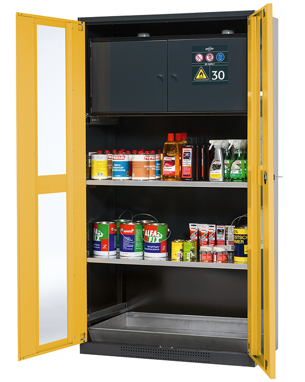 - Säkerhetslåda typ 30: för korrekt förvaring av brandfarliga farliga material i arbetsrum, enligt EN 14470-1 (typ 30) och TRGS 510, 2 självstängande gångjärnsdörrar, nedre uppsamlingsbrunn, pulverlackerat stål med 8,5 liters volym och anslutning till frånluft (DN) 75) för teknisk ventilation av säkerhetslådan