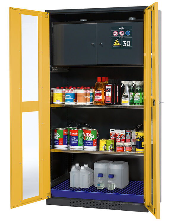 - Säkerhetslåda typ 30: för korrekt förvaring av brandfarliga farliga material i arbetsrum, enligt EN 14470-1 (typ 30) och TRGS 510, 2 självstängande gångjärnsdörrar, nedre uppsamlingsbrunn, pulverlackerat stål med 8,5 liters volym och anslutning till frånluft (DN) 75) för teknisk ventilation av säkerhetslådan