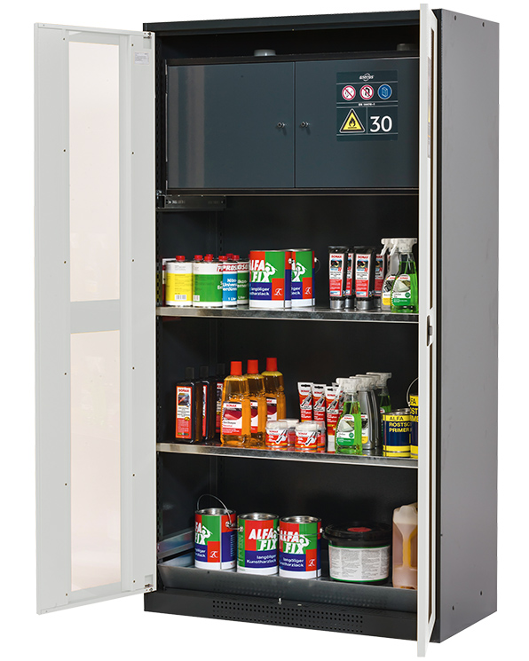 - Säkerhetslåda typ 30: för korrekt förvaring av brandfarliga farliga material i arbetsrum, enligt EN 14470-1 (typ 30) och TRGS 510, 2 självstängande gångjärnsdörrar, nedre uppsamlingsbrunn, pulverlackerat stål med 8,5 liters volym och anslutning till frånluft (DN) 75) för teknisk ventilation av säkerhetslådan