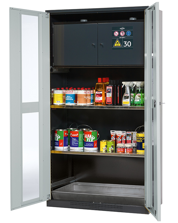 - Säkerhetslåda typ 30: för korrekt förvaring av brandfarliga farliga material i arbetsrum, enligt EN 14470-1 (typ 30) och TRGS 510, 2 självstängande gångjärnsdörrar, nedre uppsamlingsbrunn, pulverlackerat stål med 8,5 liters volym och anslutning till frånluft (DN) 75) för teknisk ventilation av säkerhetslådan