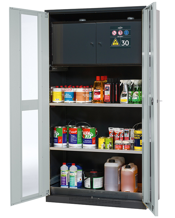 - Säkerhetslåda typ 30: för korrekt förvaring av brandfarliga farliga material i arbetsrum, enligt EN 14470-1 (typ 30) och TRGS 510, 2 självstängande gångjärnsdörrar, nedre uppsamlingsbrunn, pulverlackerat stål med 8,5 liters volym och anslutning till frånluft (DN) 75) för teknisk ventilation av säkerhetslådan