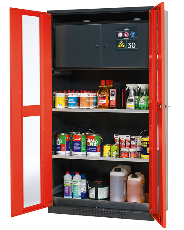 - Säkerhetslåda typ 30: för korrekt förvaring av brandfarliga farliga material i arbetsrum, enligt EN 14470-1 (typ 30) och TRGS 510, 2 självstängande gångjärnsdörrar, nedre uppsamlingsbrunn, pulverlackerat stål med 8,5 liters volym och anslutning till frånluft (DN) 75) för teknisk ventilation av säkerhetslådan