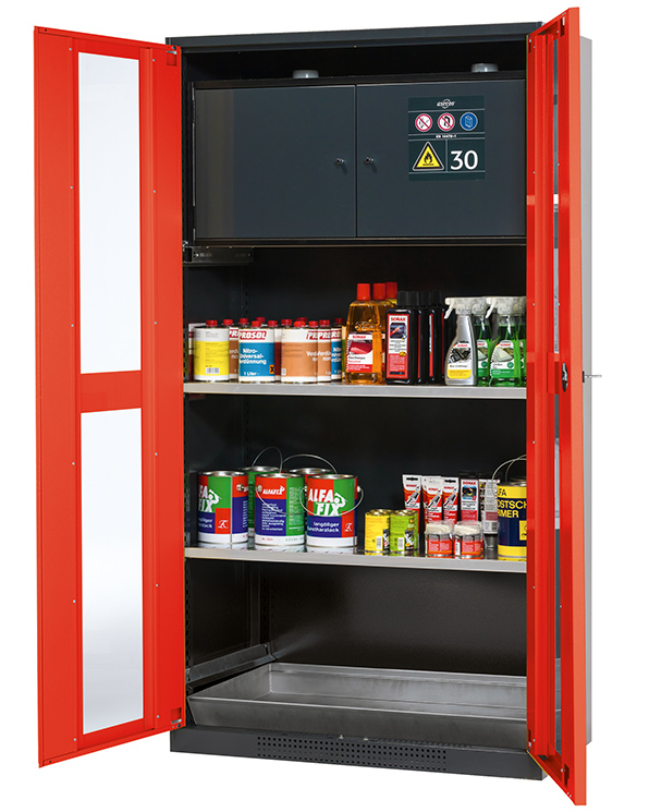- Säkerhetslåda typ 30: för korrekt förvaring av brandfarliga farliga material i arbetsrum, enligt EN 14470-1 (typ 30) och TRGS 510, 2 självstängande gångjärnsdörrar, nedre uppsamlingsbrunn, pulverlackerat stål med 8,5 liters volym och anslutning till frånluft (DN) 75) för teknisk ventilation av säkerhetslådan