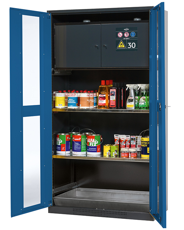- Säkerhetslåda typ 30: för korrekt förvaring av brandfarliga farliga material i arbetsrum, enligt EN 14470-1 (typ 30) och TRGS 510, 2 självstängande gångjärnsdörrar, nedre uppsamlingsbrunn, pulverlackerat stål med 8,5 liters volym och anslutning till frånluft (DN) 75) för teknisk ventilation av säkerhetslådan