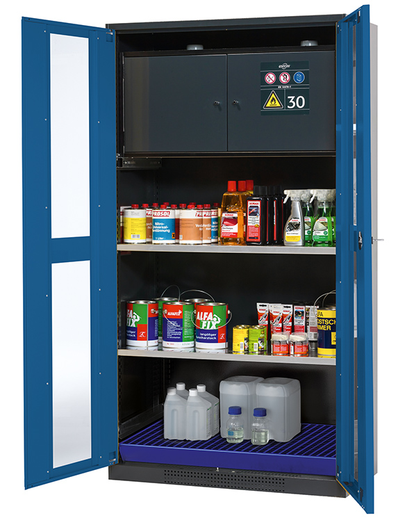 - Säkerhetslåda typ 30: för korrekt förvaring av brandfarliga farliga material i arbetsrum, enligt EN 14470-1 (typ 30) och TRGS 510, 2 självstängande gångjärnsdörrar, nedre uppsamlingsbrunn, pulverlackerat stål med 8,5 liters volym och anslutning till frånluft (DN) 75) för teknisk ventilation av säkerhetslådan