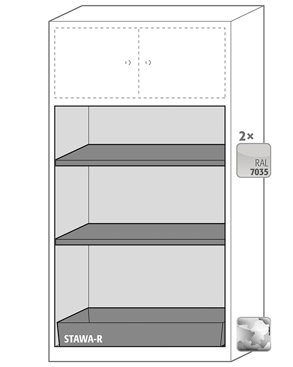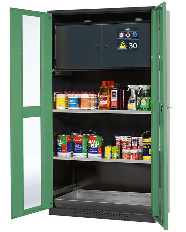 - Säkerhetslåda typ 30: för korrekt förvaring av brandfarliga farliga material i arbetsrum, enligt EN 14470-1 (typ 30) och TRGS 510, 2 självstängande gångjärnsdörrar, nedre uppsamlingsbrunn, pulverlackerat stål med 8,5 liters volym och anslutning till frånluft (DN) 75) för teknisk ventilation av säkerhetslådan
